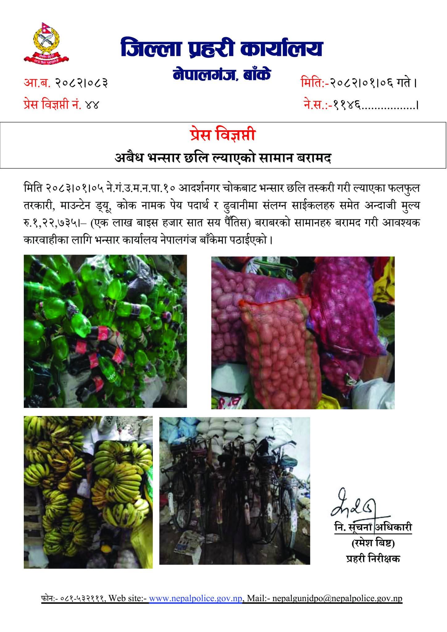 नेपालगञ्ज, बाँके प्रहरीले भन्सार छली गरी ल्याइएका विभिन्न सामान बरामद गरेको छ। जिल्ला प्रहरी कार्यालय बाँकेका अनुसार नेपालगञ्ज उपमहानगरपालिका–१० आदर्शनगर चोकबाट अवैध रूपमा ल्याइएका सामग्री नियन्त्रणमा लिइएको हो।